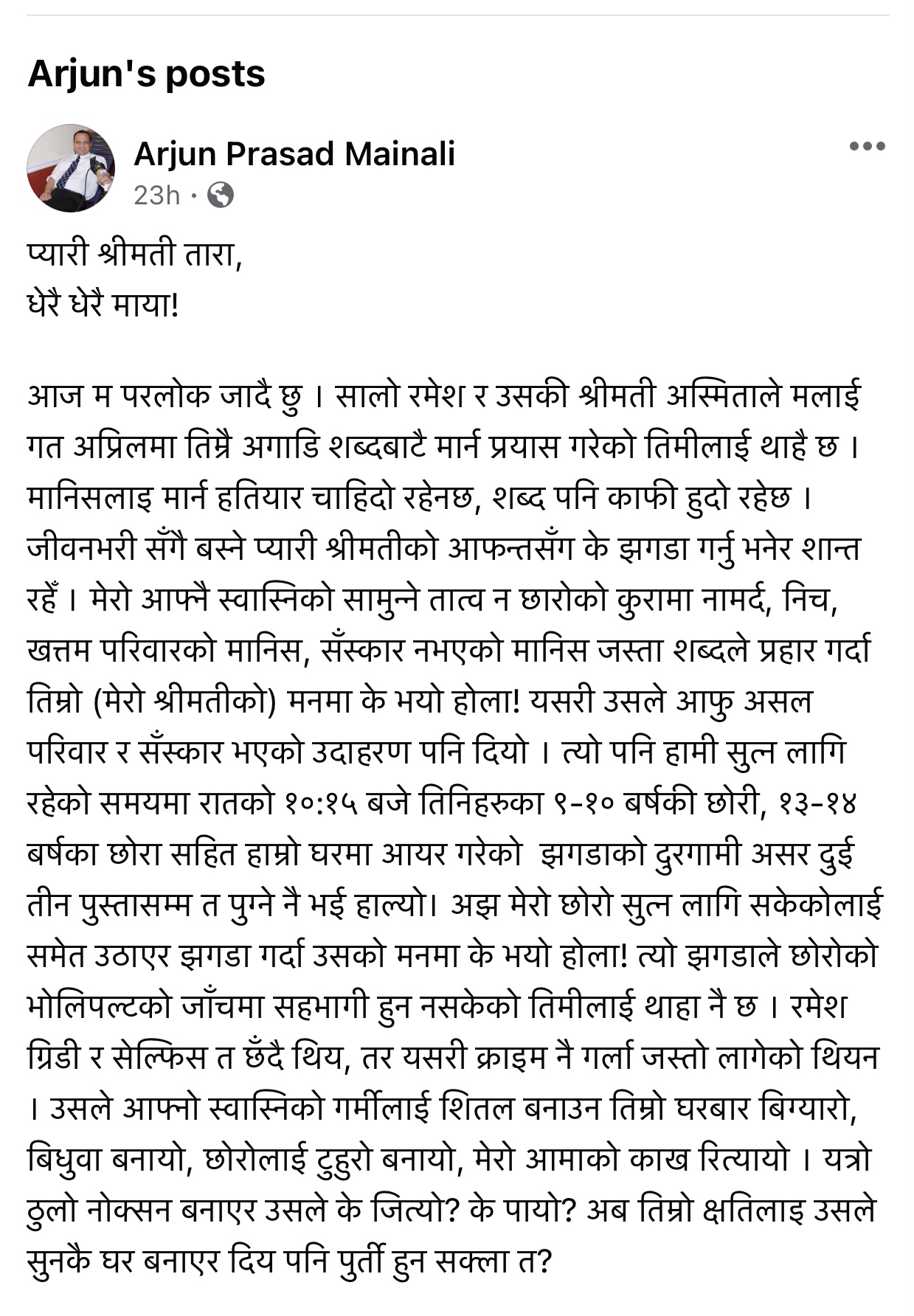 According to a preliminary investigation, Mainali left an apparent suicide note on his Facebook.