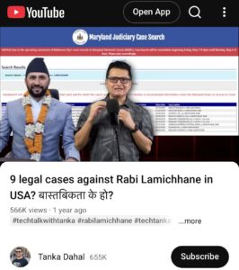 Meanwhile, Tanka Dahal, a Nepali YouTuber based in the United States, claimed in a viral video that Rabi Lamichhane has nine unresolved legal cases in the U.S. state of Maryland, including credit-related lawsuits filed by companies such as American Express Bank and Midland Funding LLC. Dahal presented screenshots from the Maryland Judiciary Case Search website, showing multiple cases under the name “LAMICHHANE, RABI.” The video, titled “9 legal cases against Rabi Lamichhane in USA? वास्तविकता के हो?”, has received over 566,000 views.